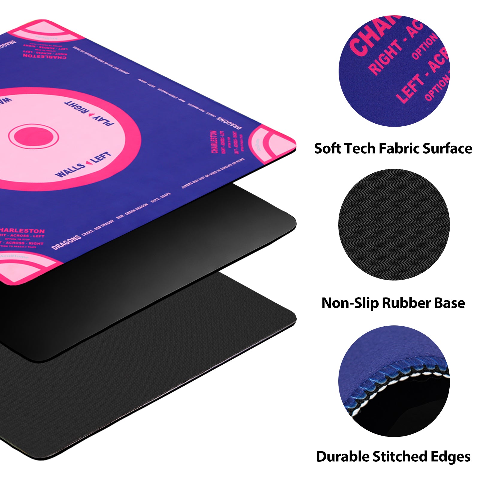 Featuring NMJL-aligned rule references, directional guides, and Charleston reminders, the mat is designed for fast learning and smooth gameplay. Its non-slip backing keeps everything steady, while the soft, cushioned surface reduces tile noise and protects your table.